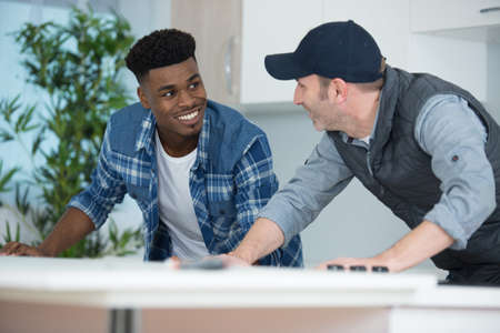 Happy young couple taking delight in putting together self assembly furniture as they move into their new house.