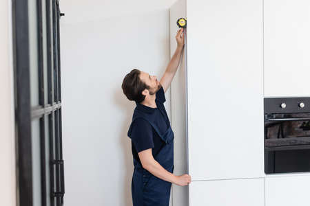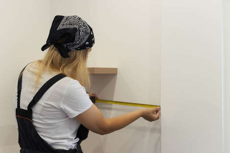 a girl of European appearance with blond hair in a black bandana, a white T-shirt and in a special suit in her hands a tape measure measures the shelves on the wall. The concept of equality and work
