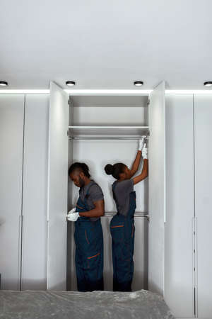 Teamwork and professional cooperation concept. Man and woman installing bedroom closet