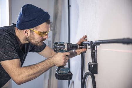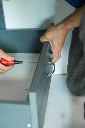 Joiner collects a new cupboard with a hand tool. carpenter collects a locker. Toned image. fastens the hinges of the cabinet door with a screwdriver. from the side