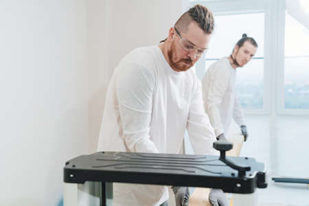 Craftsman doing renovation work at home improvement with coworker, measure wooden floor and interior design concept.
