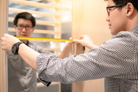 Young Asian man using tape measure for measuring mirror on modern wooden cabinet in walk-in closet showroom. Shopping furniture for home improvement. Interior design concept