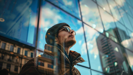 A man in a beanie and sunglasses gazes up at the skyline, reflecting the urban environment through mirrored glass buildings.