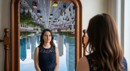 Woman looking at reflection in the mirror with reflection of skyscrapers