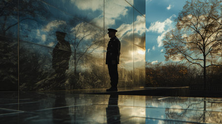 A single person stands silhouetted against a vibrant sunset, their reflection mirrored in a calm body of water. The clouds are ablaze with fiery hues, creating a captivating scene.