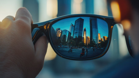 Sunglasses reflect a vibrant skyline filled with tall skyscrapers, showcasing city life and adventure in a dynamic urban setting.