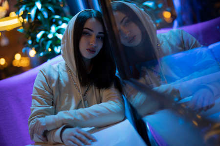 Sad woman. Neon light portrait. Loneliness melancholy. Upset depressed pensive girl in pink blue color gradient glow isolated on dark copy space background.