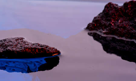 A vibrant sunset with orange and pink clouds reflects in a puddle surrounded by dark gravel, creating a surreal, inverted landscape.