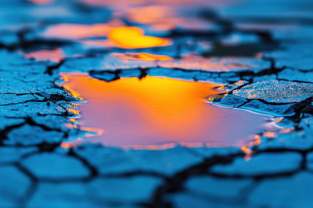 Rainwater collects in a shallow puddle atop cracked dry soil reflecting warm hues from the surrounding landscape. Light captures the textures of both the water and the ground beneath it.
