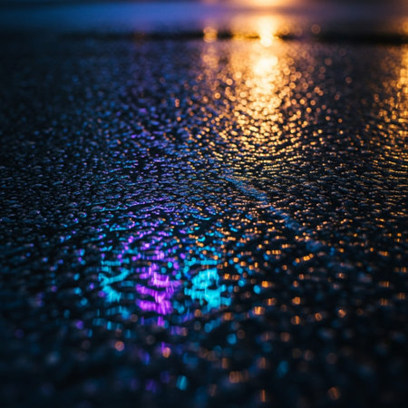 Captivating reflections dance across the wet pavement during a rainy evening, showcasing vibrant colors from city lights that create a unique urban atmosphere.