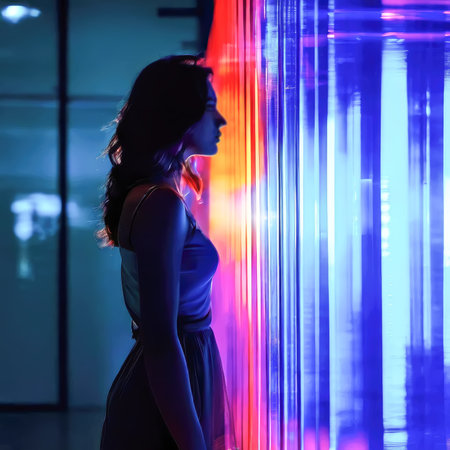 A young person gazes upwards mesmerized by brilliant neon colors in the background.