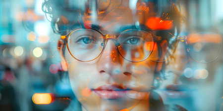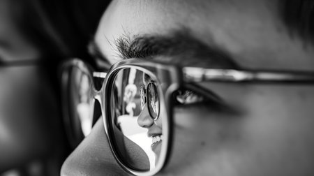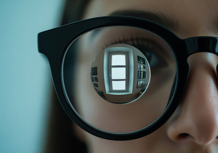 A closeup shot of a person wearing glasses with a reflection of another person in the lenses, showcasing the importance of vision care and eye glass accessories AIG50