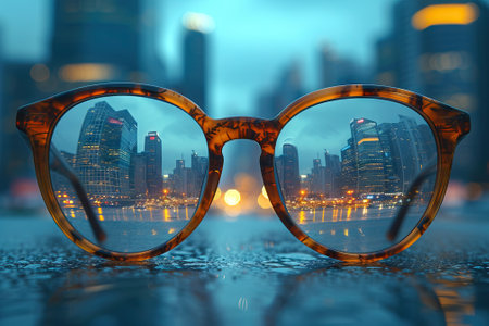 A vibrant city skyline reflected in glasses highlights illuminated skyscrapers and displays of digital data, capturing the essence of urban life at twilight.