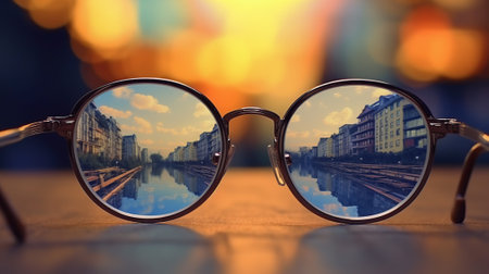 A stylish pair of glasses showcases a stunning reflection of a vibrant city skyline at night, with colorful lights creating a dreamy atmosphere.