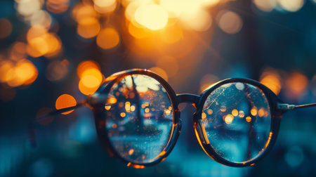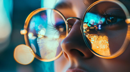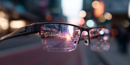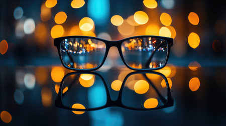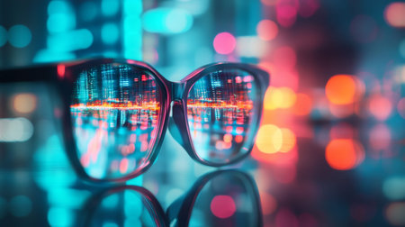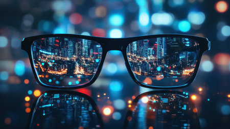 Glasses reflecting bright city lights in an abstract blur, symbolizing vision, modern urban life, and technological progress with a futuristic atmosphere.