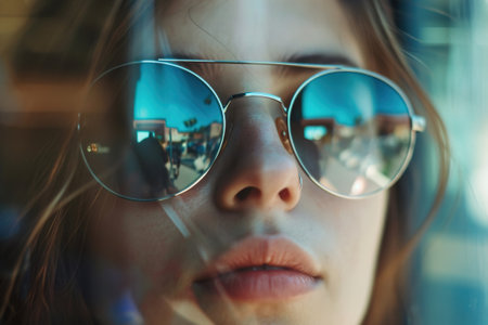 Close-up face. Reflection in sunglasses, showcasing the environment from an unexpected point of view. Summer time.