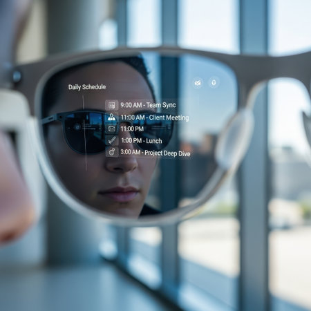 Reflection of digital art software UI in creative designer's glasses, adding depth to a modern artistic workspace