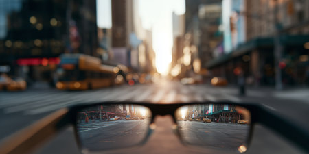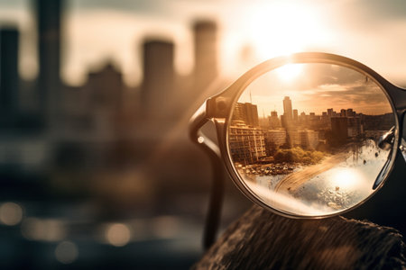 A person?s stylish shades mirror a luminous urban skyline at dusk, blending modern architecture with warm sunset hues for a striking visual contrast.