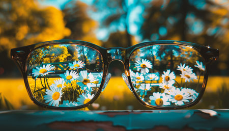 Close-up of colorful sunglasses with vibrant reflections of tropical scenery, creating a bold and trendy summer aesthetic.