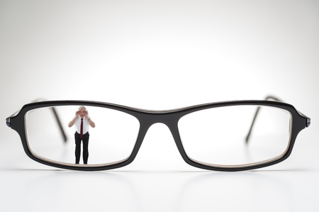 Diminutive elderly man peering through a lens on a pair of spectacles or prescription glasses , a humorous take on aging eyesight requiring corrective glasses