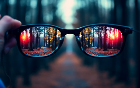 Hands hold glasses framing a lush forest scene, capturing the interplay of reality and imagination at dawn.