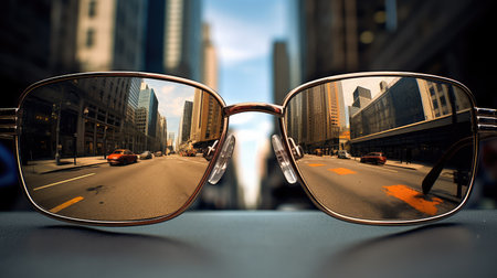 Stylish sunglasses reflecting an urban scene in their lenses. Modern and trendy composition highlighting fashion and city lifestyle.