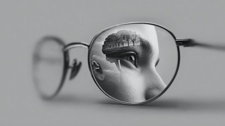 Detailed close-up of a person's eye, reflected in glasses with glowing particles and bokeh effects, symbolizing vision, perspective, and imagination. Ideal for creativity and innovation concepts.