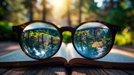 Sunglasses resting on an open book with nature reflection, backlit by a sun flare.