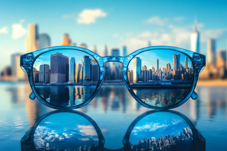 Reflection of a City Skyline in Sunglasses Against a Tranquil Water Surface, Capturing Urban Beauty and Calmness in a Vibrant Environment