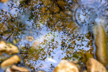 Reflection of trees in the water of a stream with spherical circles from falling raindrops. Landscape