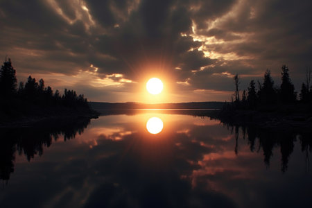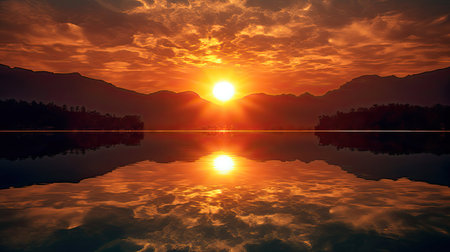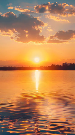 A stunning sunset over a calm lake, with the golden sun reflecting off the water and casting a warm glow across the sky.