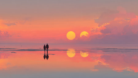 Two individuals are depicted walking towards a vibrant sunset. The composition features a mirrored reflection on the water, doubling the sunset and cloud formations. Warm hues of orange, pink, and purple dominate the scene, suggesting an outdoor environment with soft lighting. This image could be suitable for various commercial and editorial applications.