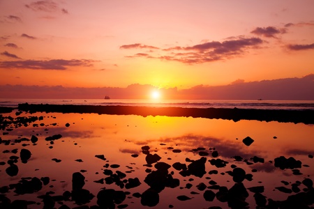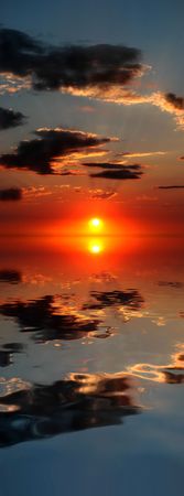 Beautiful sunset over the sea with clouds and sky reflected in water