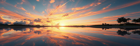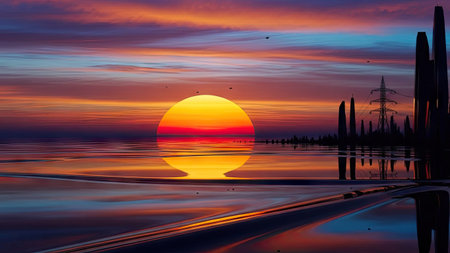 A stunning sunset scene showcases a large sun reflecting on water, complemented by colorful skies and land silhouettes. The image features a range of colors, from warm oranges and reds to cool blues and purples, and may be ideal for commercial or editorial applications. The image suggests an outdoor environment.