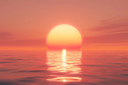 3D render of a large, round, glowing pink and orange sun setting over the ocean, with a blue sky and a reflection on the water, captured in a wide-angle view. --ar 53:30 --v 6.1 Job ID: 02afc99b-3eba-420f-95d4-77aef05a1361