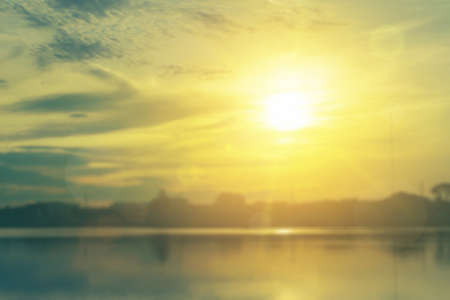 Relaxing outdoors vacation landscape concept: Abstract blurred sunlight beach colorful blurred bokeh background with retro effect autumn sunset sky have blue bright, white, and color orange calm.