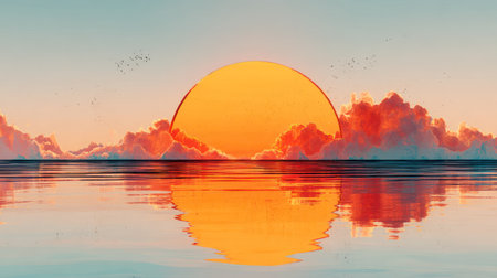 Digitally rendered or stylized depiction of a large, luminous orange sun partially obscured by dramatic, brightly lit clouds situated along the horizon line, casting a strong reflection upon the still surface of the water below, with a few small birds flying overhead in the soft, pastel-toned sky.