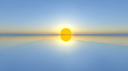Highly stylized, minimalist depiction of a perfectly round, bright yellow celestial body centered on the horizon, casting an intense, elongated reflection upon an extremely flat, smooth expanse of blue water, creating strong horizontal symmetry between the clear blue sky and its reflection.
