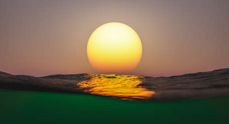 sunset over the surface of the sea with views of the seabed and the sun reflected on the water. 3d rendering