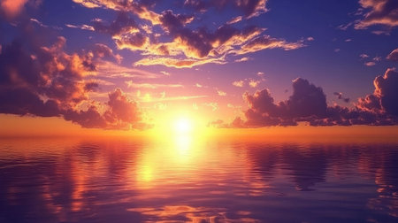 A breathtaking view of a sunset illuminating the calm ocean waters, showcasing vibrant colors in the sky. Perfect for conveying tranquility and natural beauty.