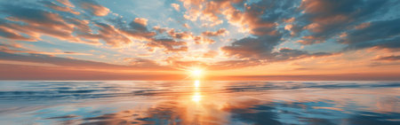 A breathtaking sunset casts vibrant hues across the calm ocean, reflecting beautifully on the water's surface. Clouds frame the peaceful scene, creating a serene atmosphere.