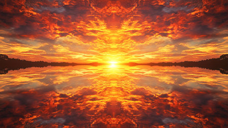 A breathtaking sunset over a calm lake, fiery colors reflected in the water.