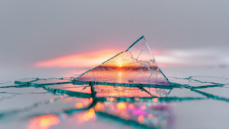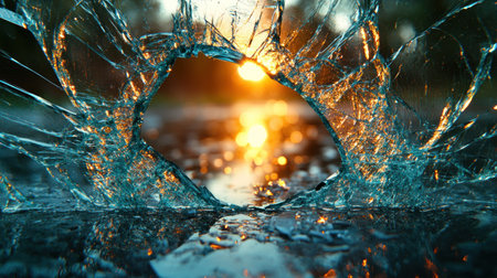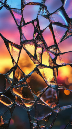 Shattered glass with sunset reflection, abstract art concept
