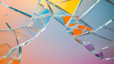 This striking image showcases vibrant shattered glass fragments illuminated by a colorful gradient background, creating a dynamic and mesmerizing visual effect.