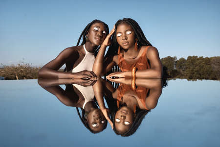 Undivided and always united. Shot of two attractive young women sitting next to a pond with their reflection in it in nature.