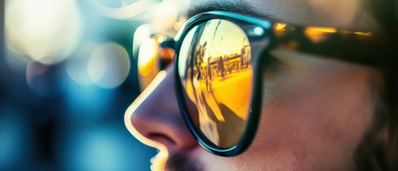 A person wearing sunglasses shows reflections of a bustling city scene capturing movement and light during the golden hour.