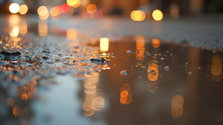 Captivating reflection of city lights in puddles, creating a mesmerizing bokeh effect on a rainy night. The wet pavement reflects the vibrant cityscape, adding a touch of magic to the urban landscape.
