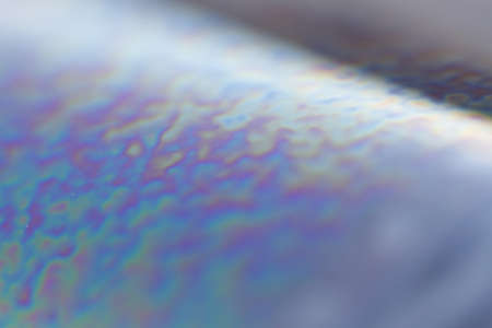 Detail showing extreme close-up of iridescent oil slick on water surface showing vibrant rainbow colors and ripple patterns in macro detail.