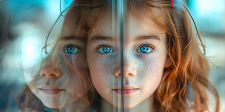 A captivating portrait of a young woman with curly hair gazing thoughtfully at her reflection in a window, evoking deep emotions and serenity.