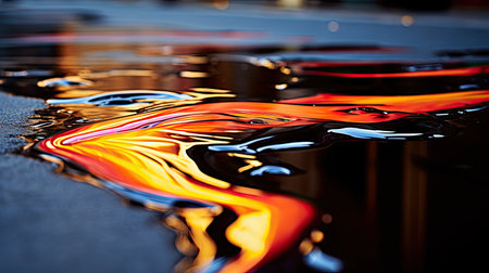 Close-up view of a puddle on a dark surface, reflecting vibrant colors of light, possibly from the sunrise or sunset. The puddle is surrounded by dark gray and black areas, and there is some frost or ice visible around the edges.